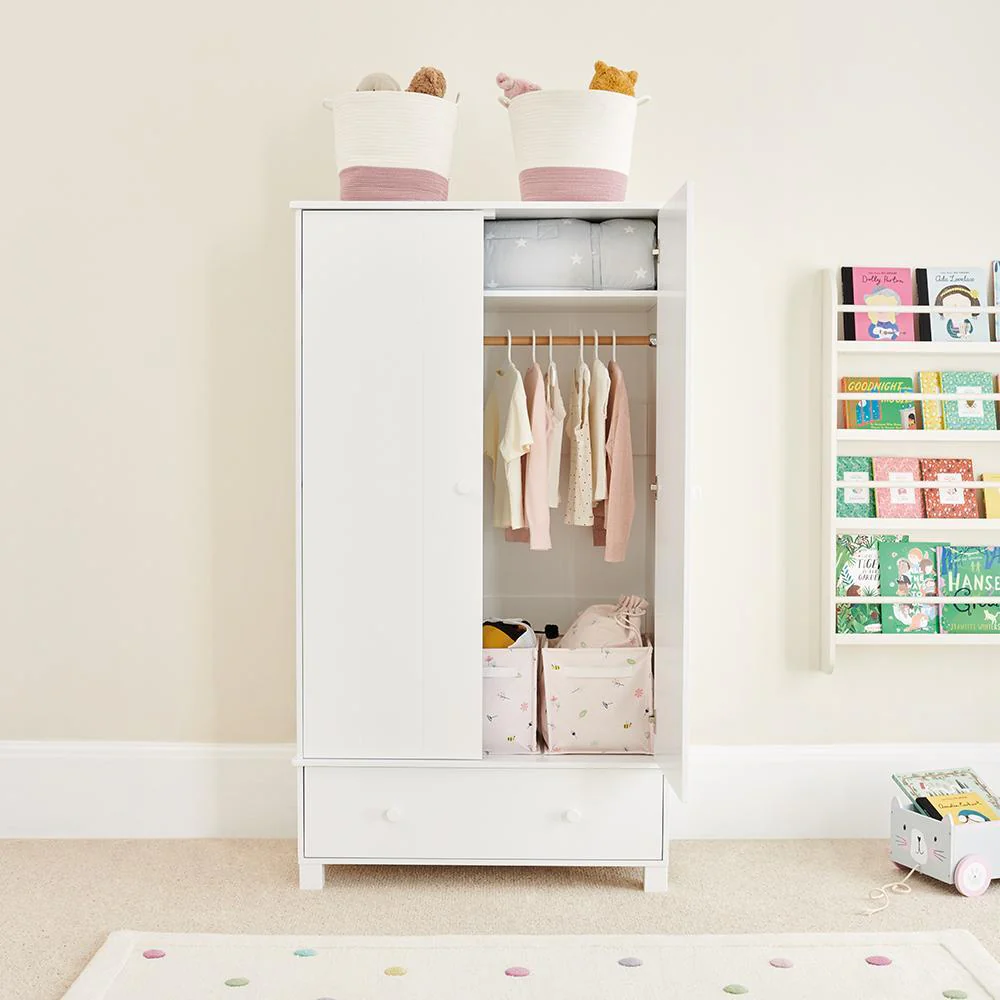 This contemporary kids' wardrobe has plenty of hanging and storage space and a smooth-running, roomy drawer at the base. The rail can be fitted at three heights depending on the age of your child, and the shelf above can be removed. the tongue and groove detail makes this wardrobe suitable for a newborn's nursery right up to a teenager's bedroom, it will even last until they've flown the nest.